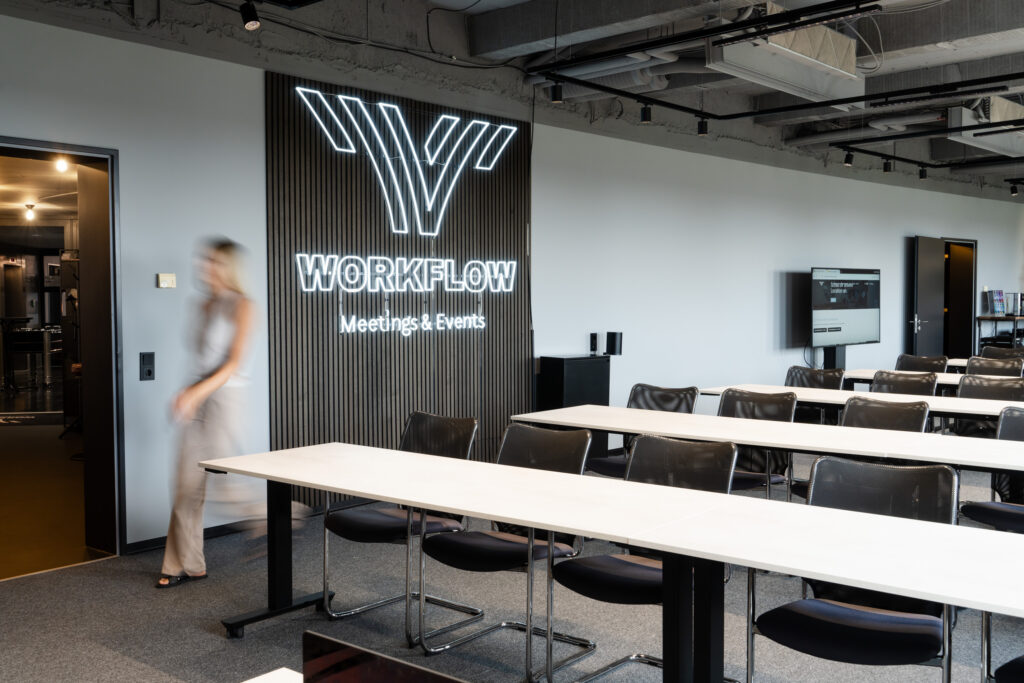 Entdecke unseren neuen, großzügigen Seminar- und Eventraum – die "Workflow Lounge". Mit 100 m² Fläche bietet sie Platz für bis zu 50 Personen und eignet sich ideal für Seminare, Workshops und Events.
